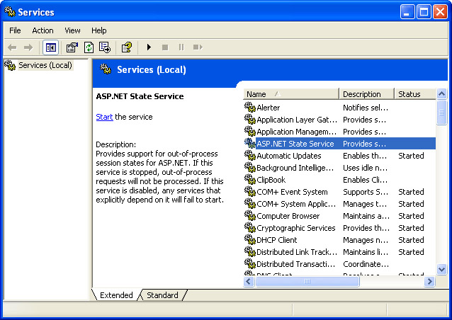 Start the ASP.NET State Service on the desired server from the Services MMC snap-in. The Windows XP Professional Services snap-in is shown in the following illustration.