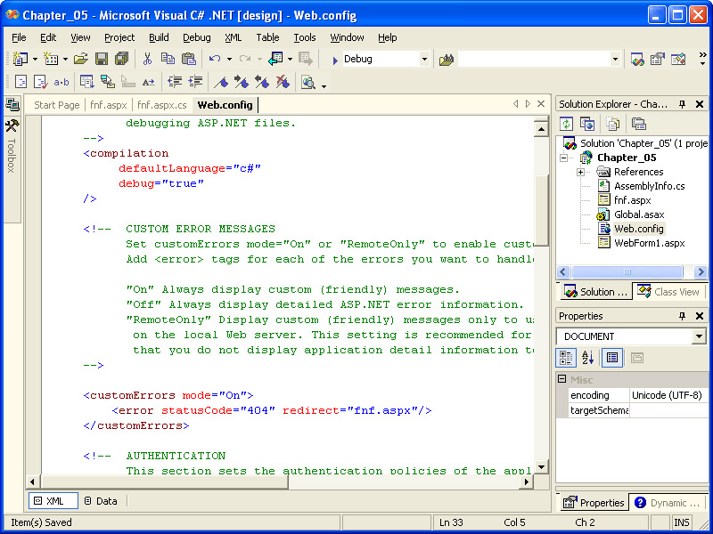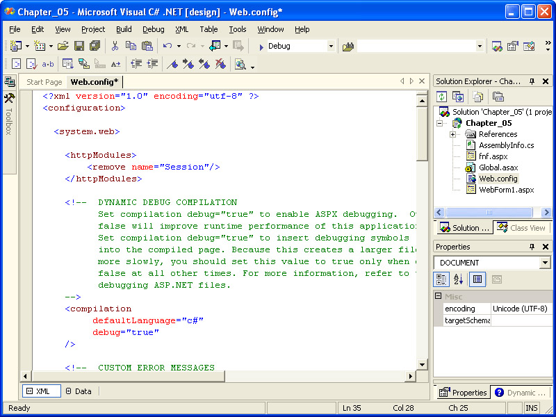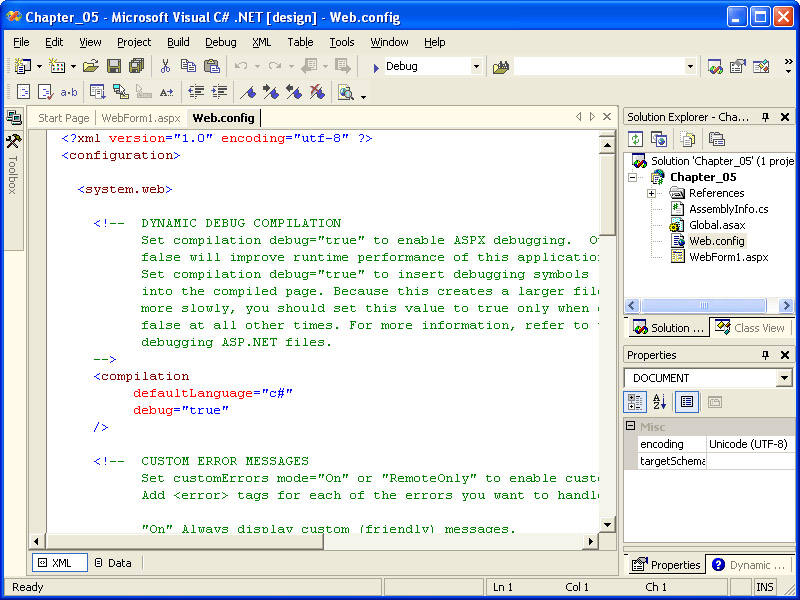 The Web.config file will be opened for editing using the Visual Studio .NET XML editor, as shown in the illustration on the following page. We’ll look at examples of editing this file later in the chapter, so you might want to leave it open.