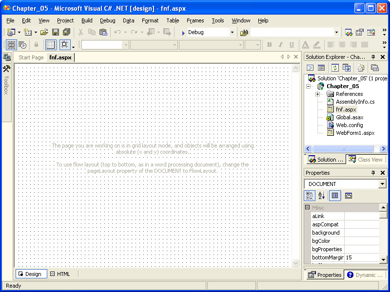 The new Web Form will be displayed in Design view, as shown in the illustration on the following page.