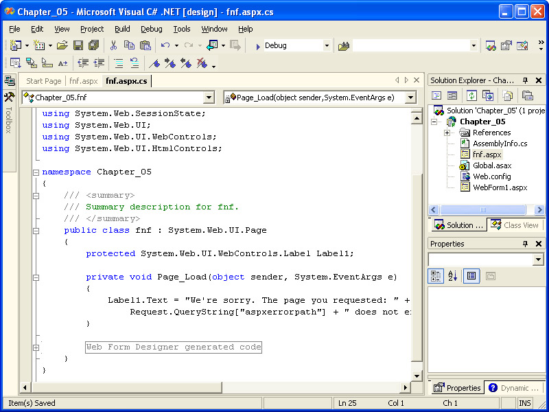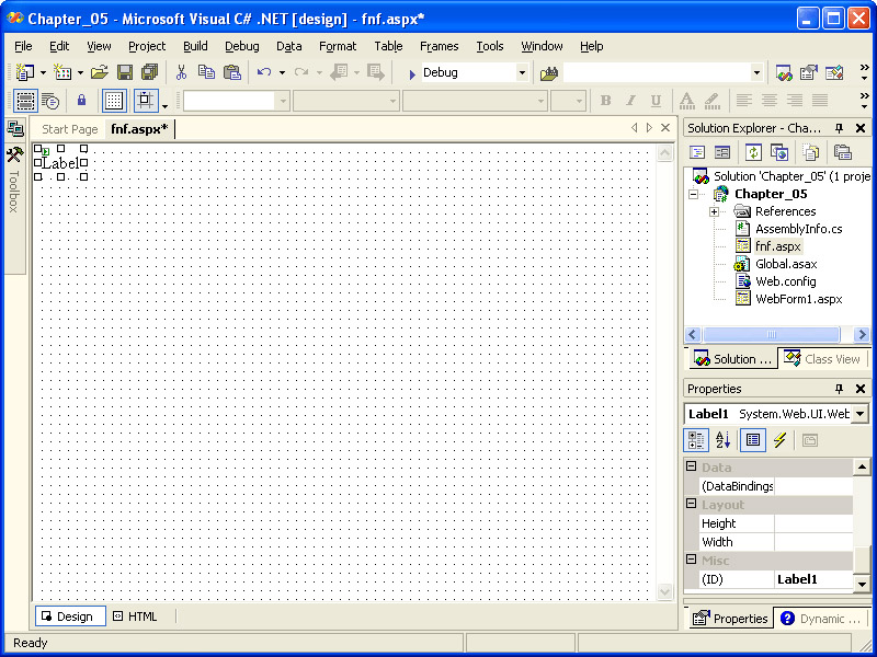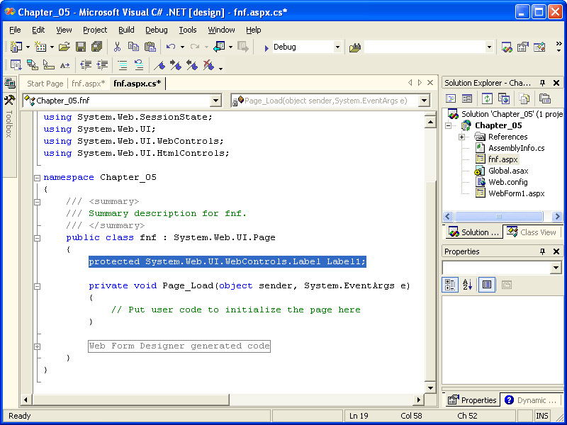 The code-behind module for fnf.aspx will be displayed in the code editor window, with the cursor automatically moved to the Page_Load event handler. Note that a local declaration (highlighted in the following illustration) has been added to the code-behind for the Label control to allow programmatic access to the control by its name, Label1:
