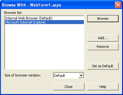 Right-click WebForm1.aspx (the default Web Form added to the project when it was created), select Browse With, then select Microsoft Internet Explorer from the Browser List window, and then click Browse, as shown in the following illustration. (This will open the page in a separate browser window, rather than one embedded in the IDE.)