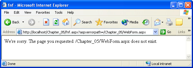 The page will redirect to fnf.aspx, and display a message similar to the following. (The path can vary depending on how you set up your project.)