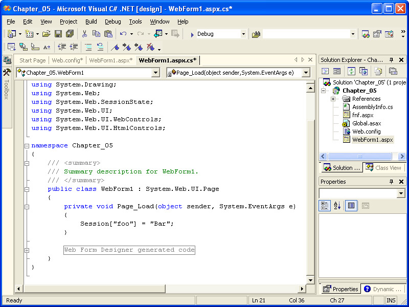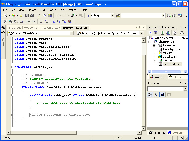 The code-behind module for WebForm1.aspx will be displayed for editing, as shown in the following illustration.