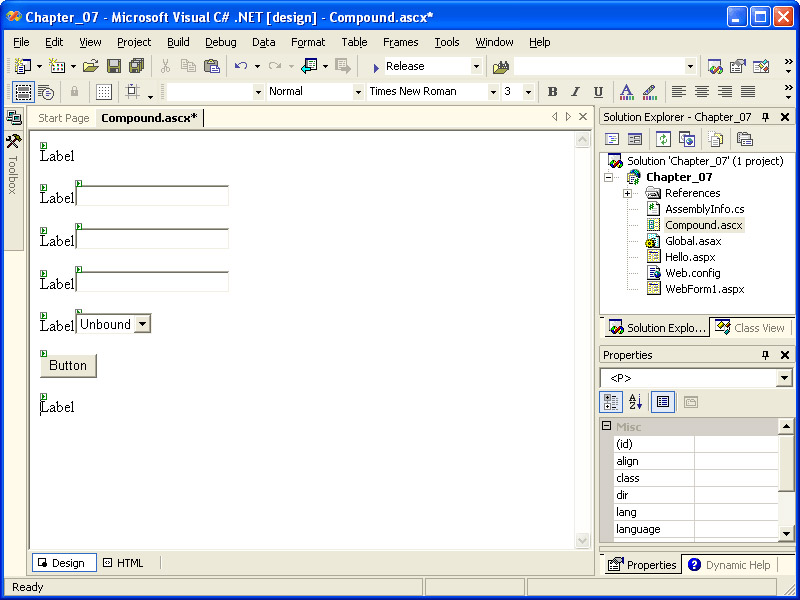When you have finished modifying the properties, the design view of Compound.ascx should look like the illustration on the next page.