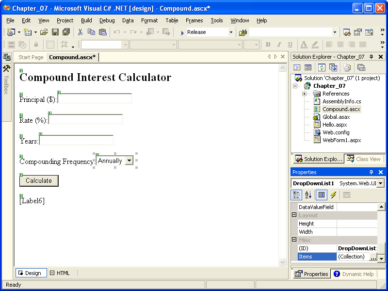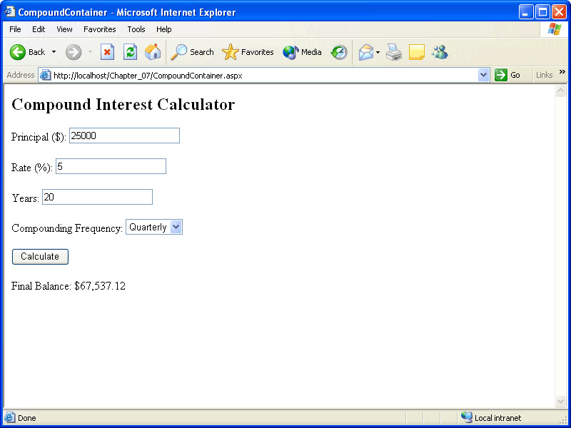 Save CompoundContainer.aspx, and then browse it using Internet Explorer by right-clicking the file in Solution Explorer and selecting Browse With. Enter amounts for the principal, rate, and years, then choose a compounding frequency, and then click Calculate. The result should look similar to the following illustration. Note that if you enter any non-integer value in the textboxes, an exception will occur when you click Calculate. You could prevent this by adding validator controls to ensure that only integer values are entered.