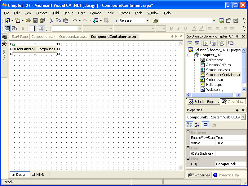 Drag the Compound.ascx user control from the Solution Explorer onto the design surface of CompoundContainer.aspx. The result should look like the illustration on the next page.