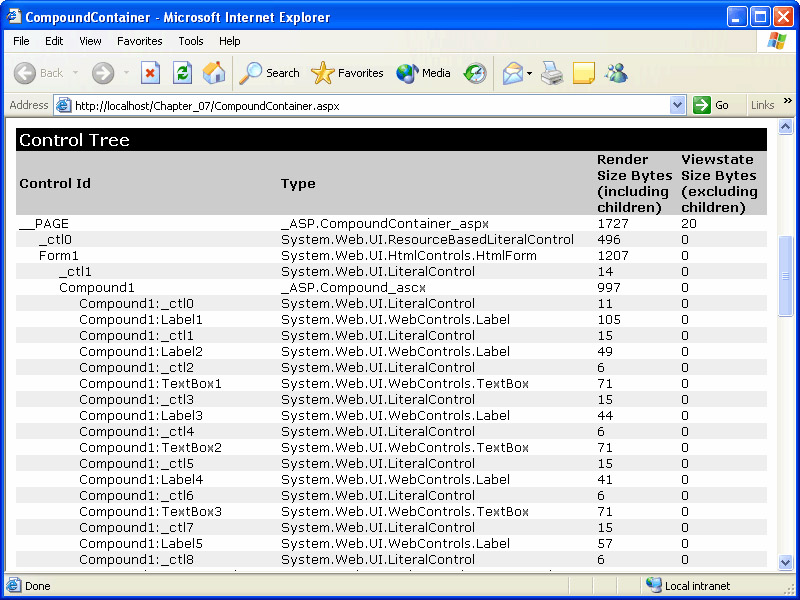 Save the file and browse the page. The control tree section of the CompoundContainer.aspx trace output is shown in the illustration on the next page. Notice that where a control has been given an explicit ID through its id tag attribute, that ID is used in the control tree.