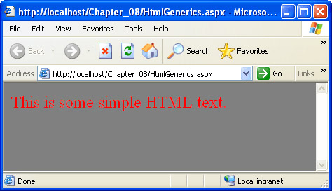 <html> <body id="Body" runat="server"> <p id="TextPara" runat="server">This is some simple HTML text.</p> </body> </html>