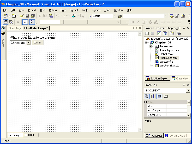 Using the tabs at the top of the editor window, switch back to HtmlSelect.aspx. Double-click the button. This will add the Enter_ServerClick event handler to the code-behind module, and switch you back to the code-behind module. Add the following code to the Enter_ServerClick event handler: