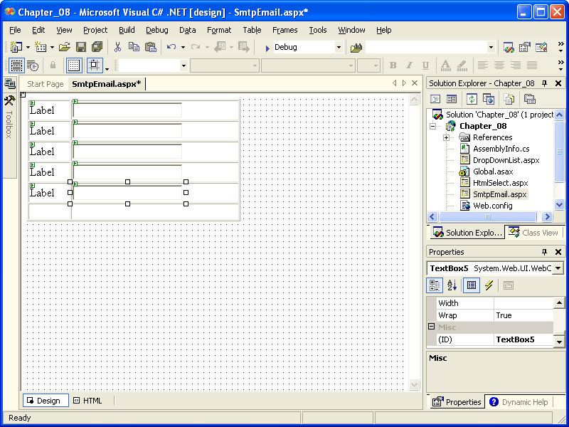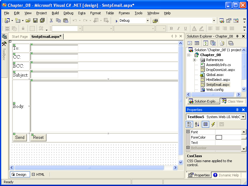 Open the file SmtpEmail.aspx created earlier in this chapter.