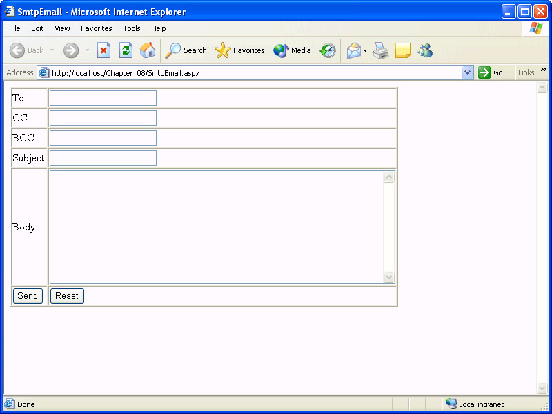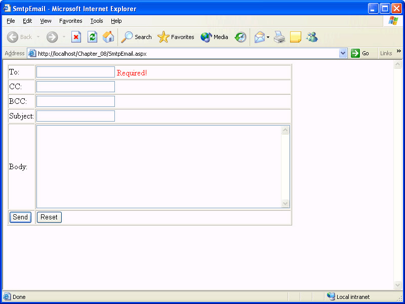 Save the page and browse it with Internet Explorer using the Browse With option. (Again, since you have changed only the .aspx file, the project does not need to be rebuilt.) If you do not enter a To address, the output will look something like the following illustration, and you will not be able to submit the page.