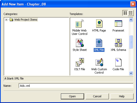 Create a new XML file by right-clicking the Chapter_08 project in Solution Explorer, selecting Add, then Add New Item, and then choosing XML File as shown in the illustration on the following page. Type the name of the file as Ads.xml.