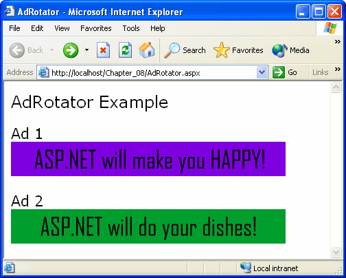 Save and build the project, and then browse AdRotator.aspx. The output should look similar to the following illustration. When you refresh the page, you should see the ads change randomly, based on the weightings set in the XML file.