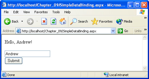 The simplest type of data binding uses the <%#expression%> syntax to replace the <%#expression%> construct with the value represented by the expression. This is different than, for instance, the <%=expression%> syntax, which simply writes the result of the expression to the browser. With the <%#expression%> syntax the substitution takes place only when DataBind() is called. For example, the following listing shows a simple page that binds to a page-level property.