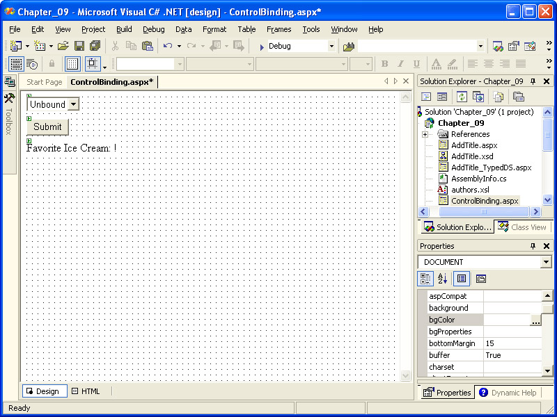 Add a new Web Form to the project. Name the form ControlBinding.aspx.