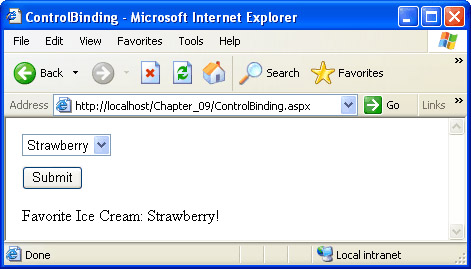Test the page by right-clicking ControlBinding.aspx, selecting Browse With, and then selecting Microsoft Internet Explorer. After you select a flavor from the drop-down list and click Submit, the resulting screen should look like the following illustration.