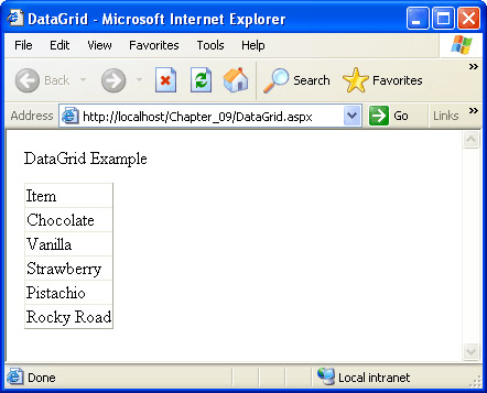 Although this is a very simple example, you used two lines of code (setting the DataSource and calling DataBind) to accomplish what would have taken considerably more code in classic ASP. Now let’s jazz things up a bit by binding to live data with multiple columns per row in a grid.