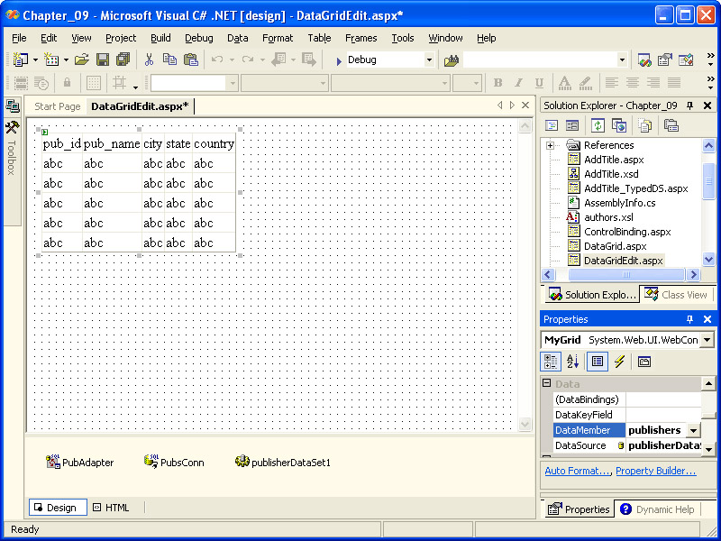 PubAdapter.Fill(publisherDataSet1) if (!IsPostBack MyGrid.DataSource = publisherDataSet1.publishers.DefaultView MyGrid.DataBind() }