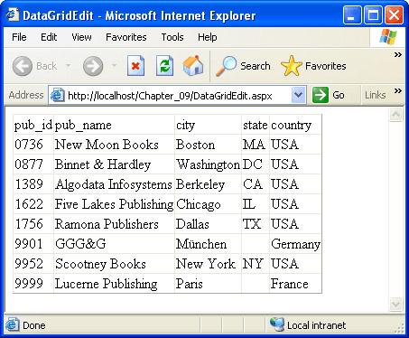 Test the page by right-clicking DataGridEdit.aspx, selecting Browse With, and then selecting Microsoft Internet Explorer. The resulting screen should look like the following illustration. Leave DataGridEdit.aspx open in the IDE, as you’ll be working on it again in the next example.