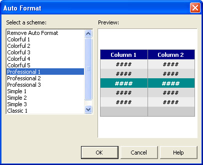 Click on AutoFormat. The Auto Format dialog box will appear. Select “Professional 1” from the scheme list, as shown in the following illustration, and then click OK.