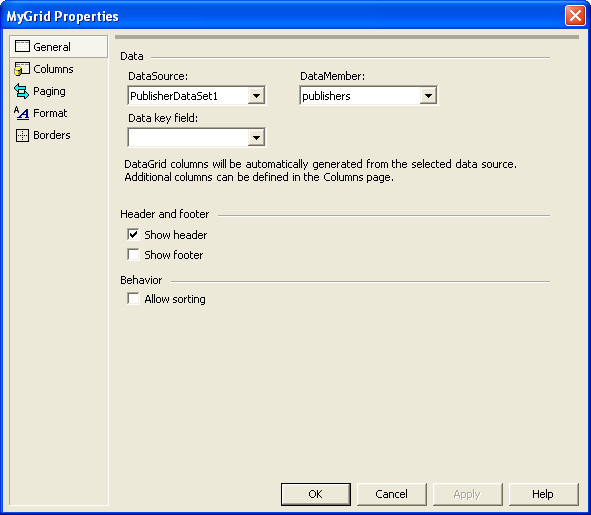 To keep the example simple, disable sorting for this example by clicking the General item and then unchecking the Allow Sorting check box. Click OK to apply the changes and close the dialog box.