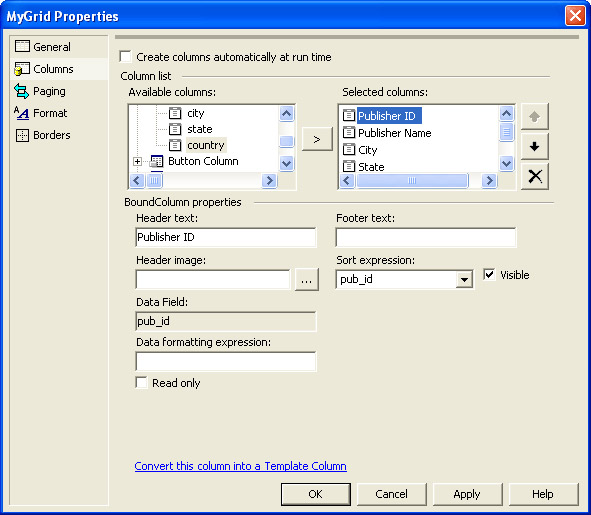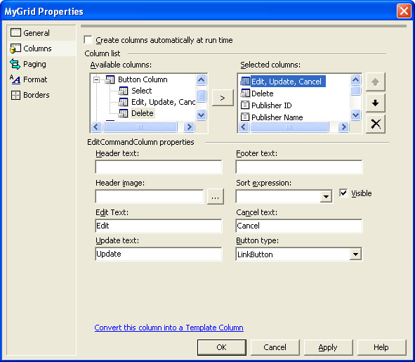 Click on Columns on the left side of the dialog box, and note that the Sort Expression for each column is set to the name of the field the column is based upon. This is because in the previous example, you used bound columns to create the columns for the grid, which automatically set a default Sort Expression based on the typed dataset to which the datagrid is bound.