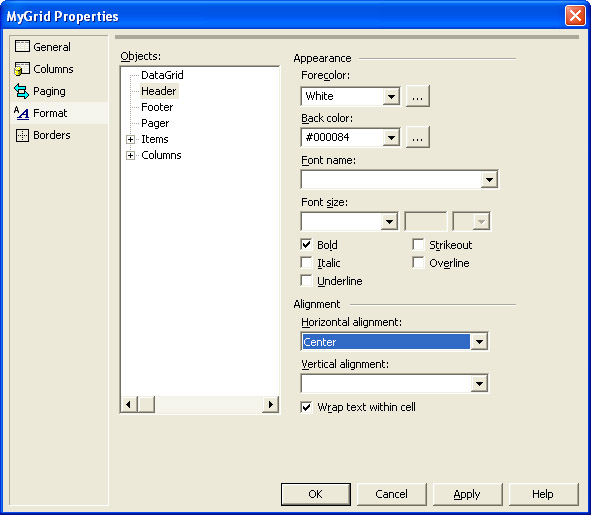 Click the Format item on the left side of the dialog box, and you can select several options from a tree view on the resulting dialog box. Click on Header and change the Horizontal Alignment to Center. When finished, the dialog box should look like the following illustration.