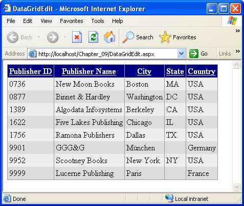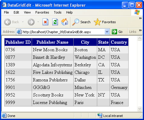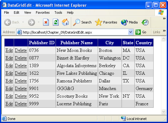 Test the page by right-clicking DataGridEdit.aspx, selecting Browse With, and then selecting Microsoft Internet Explorer. The resulting screen should look like the following illustration.