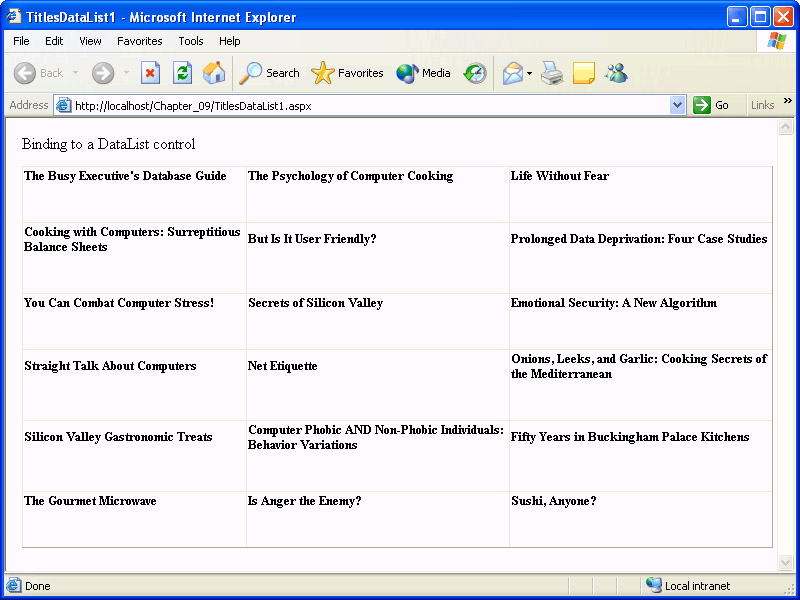 Test the page by right-clicking TitlesDataList1.aspx, selecting Browse With, and then selecting Microsoft Internet Explorer. The resulting screen should look like the following illustration.