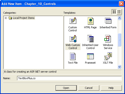 Right-click the project in Solution Explorer, select Add, and then select Add Component. The dialog box that appears has quite a few likely sounding options (including Component Class). Select the Web Custom Control entry toward the bottom of the list of options. Name the control TextBoxPlus.cs, as shown in the following illustration.