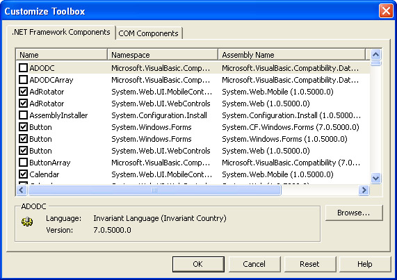 Open the Toolbox, right-click inside the Toolbox, and then select Add/Remove Items from the drop-down menu. The dialog box shown in the following illustration will appear.