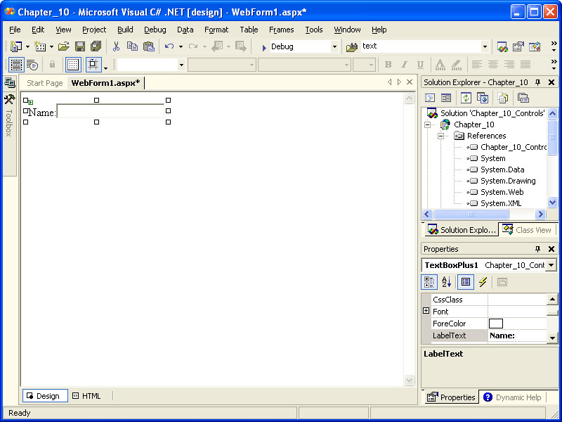 Double-click the TextBoxPlus control. This will add a copy of the control to WebForm1.aspx. Select the control, and then use the Properties window to change the LabelText property to Name:. The page with the control should look like the following illustration.