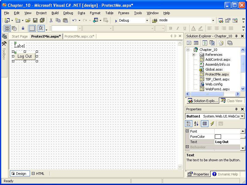 Switch back to ProtectMe.aspx and add a Label and a Button to the page, and set the button’s Text property to Log Out, as shown in the following illustration.
