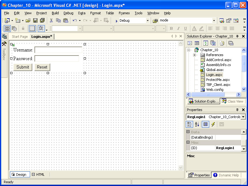 Add a new Web Form to the Chapter_10 project. Name the file Login.aspx.