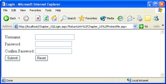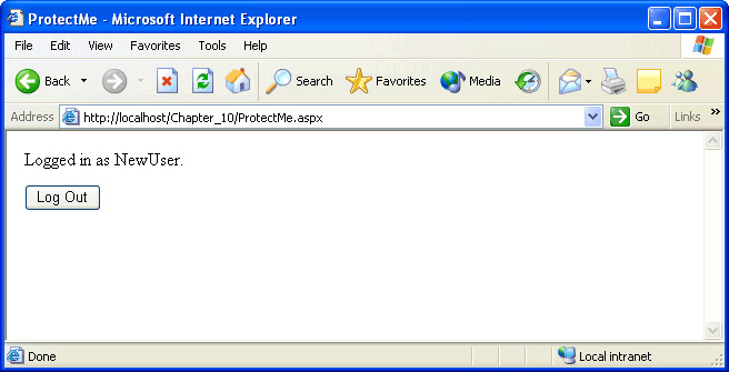 Now that you’ve finished your login page, you’ll test it by attempting to access ProtectMe.aspx, which is protected from anonymous access by the <location> section you added to Web.config earlier.