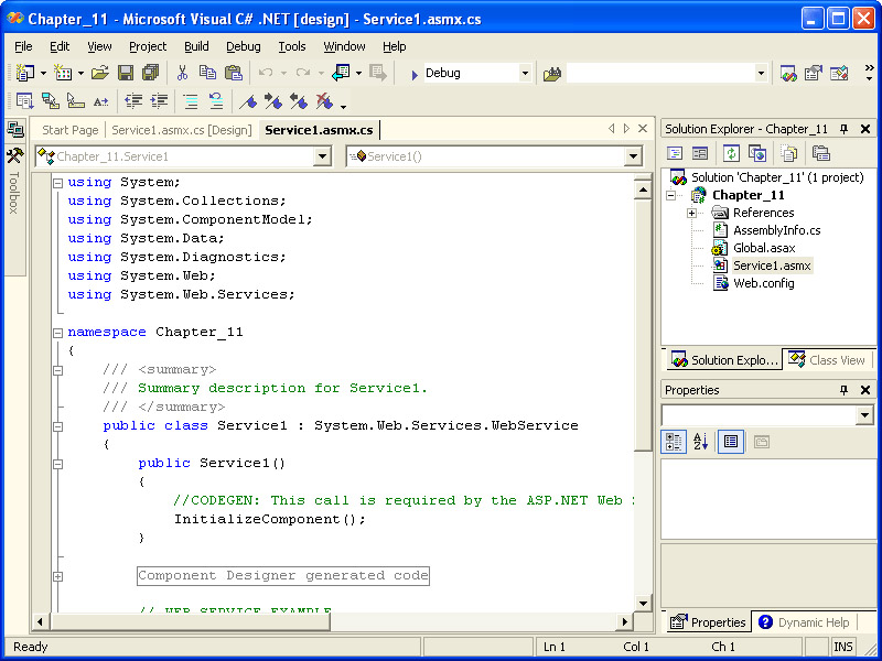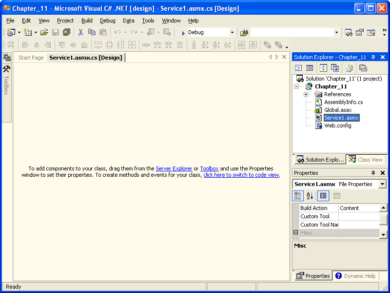 Create a new project in Visual Studio .NET. Unlike previous projects, this project should be an ASP.NET Web Service rather than an ASP.NET Web Application. Type the name of the project as Chapter_11, and click OK. The resulting screen should show the default Web Service, Service1.asmx.cs, in design view, as shown in the following illustration.