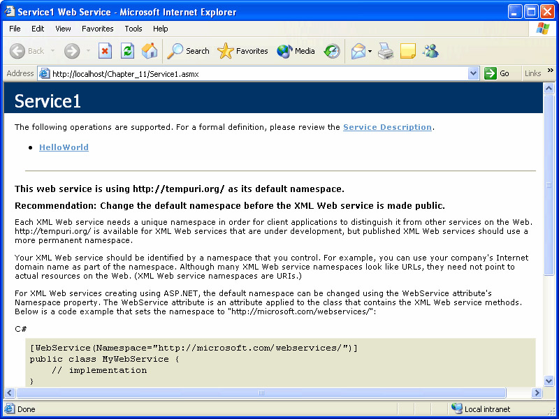 One thing that stands out on the illustration is the warning that the Web service is using the http://tempuri.org/namespace. There is a recommendation to change the namespace before the Web service is made public. Although it is unlikely this Web service will ever be made public, let's fix this now. Close the browser and return to the source code.