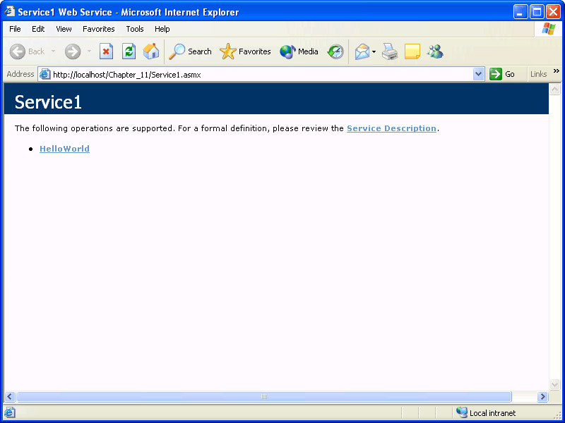 Browse the Web service with Internet Explorer. The screen should look similar to the illustration on the next page. (Note that the description specified is the same as the Description property of the WebMethod attribute.)