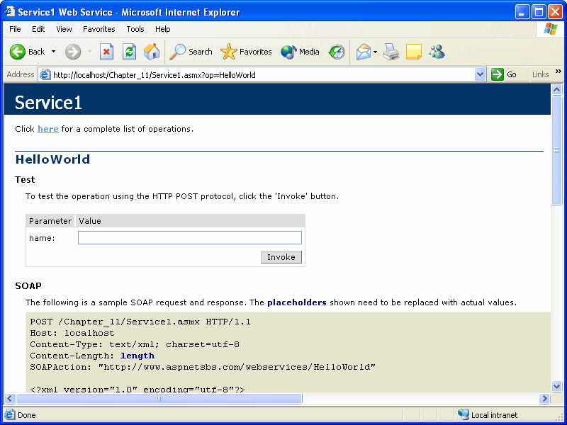 You can scroll through the entire document and see the complete Web Services Description Language (WSDL) contract for the Web service method. Click the Back button on the browser and select the other link on the page, HelloWorld. The screen should look similar to the following illustration.