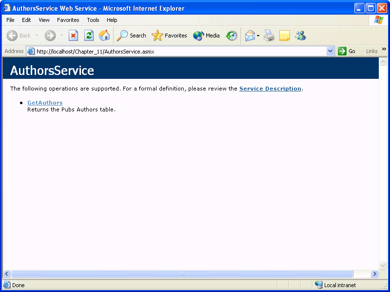 [WebMethod(Description="Returns the Pubs Authors table.") public DataSet GetAuthors( DataSet dsAuthors = new DataSet() SqlConnection cn = new SqlConnection() SqlDataAdapter da string strCn strCn=@"server=(local)\vsDotNet;database=pubs;" "Trusted_Connection=yes" cn.ConnectionString=strCn da=new SqlDataAdapter "SELECT * FROM Authors ORDER BY au_LName,au_FName",cn) da.Fill(dsAuthors,"Authors") return dsAuthors }