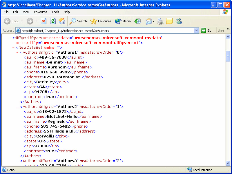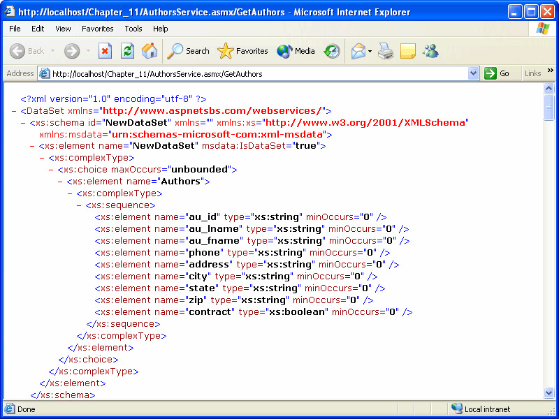 The schema for the resulting data is at the top of the result from invoking the Web service. Scroll down in the browser window, and you will see the actual data, as shown in the following illustration.