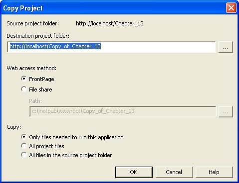 You can copy files either to a URL using the Microsoft FrontPage server extensions, or to a file share. The Copy Project dialog box is shown in the following illustration.