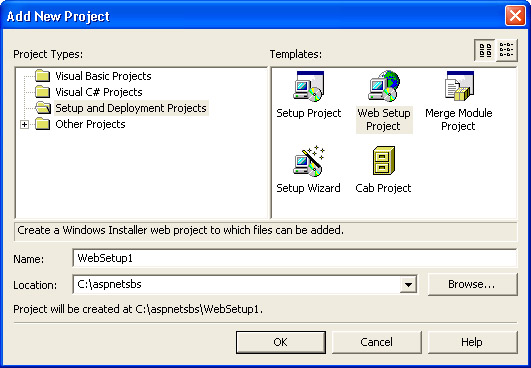 Another method that Visual Studio .NET offers for deploying Web applications is the Web Setup Project, which is one of the templates available in the Setup And Deployment Projects project type. The following illustration shows the Web Setup project selected in the Add New Project dialog box.