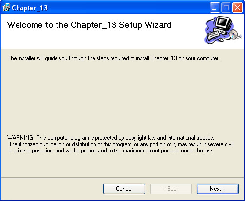 Locate the set-up package created by the Web Setup project. It should be located in the Debug or Release subdirectory of the directory containing the Web Setup project, and will be called WebSetup1.msi if you used the default project name of WebSetup1. Copy the file to the target server and execute it. The following illustration shows the initial screen of the installation program.