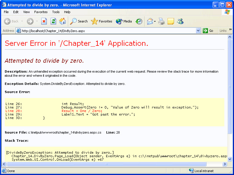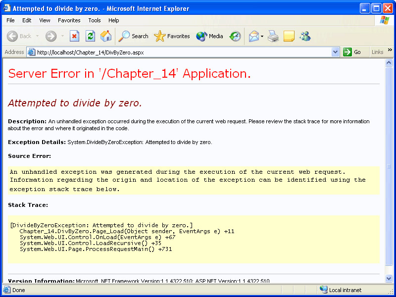 Browse DivByZero.aspx again using Internet Explorer. The resulting screen should look similar to the following illustration.