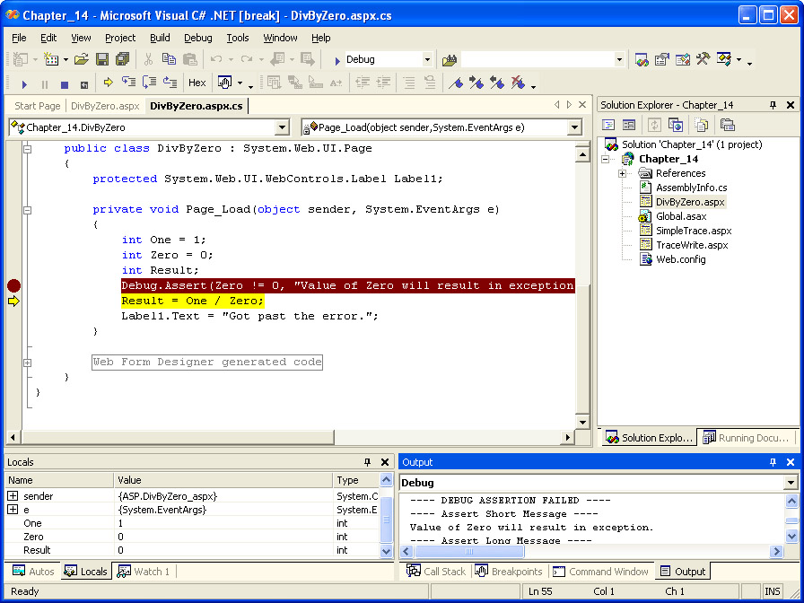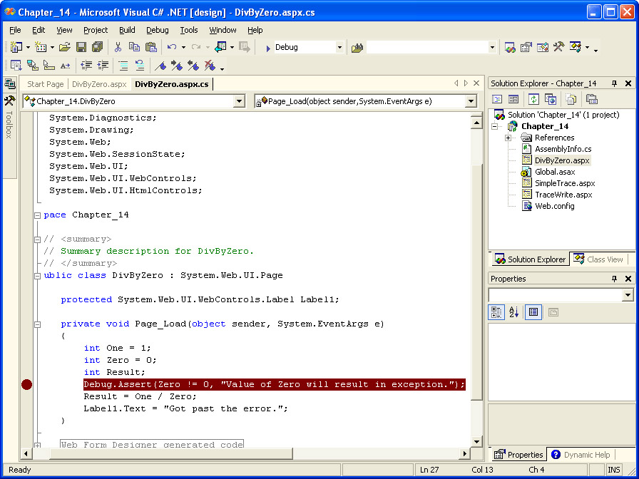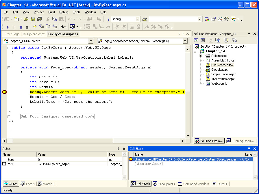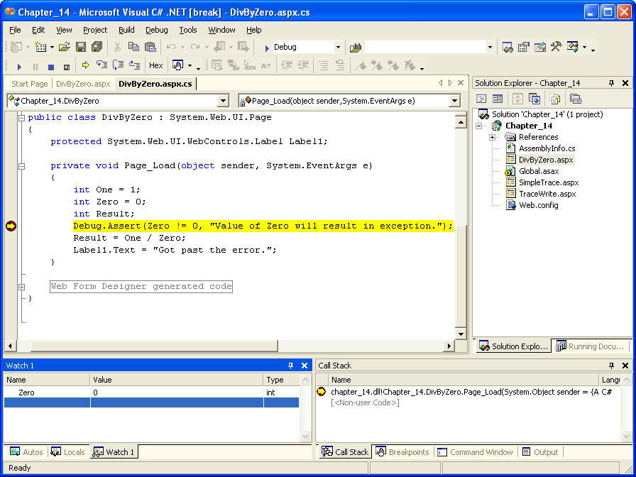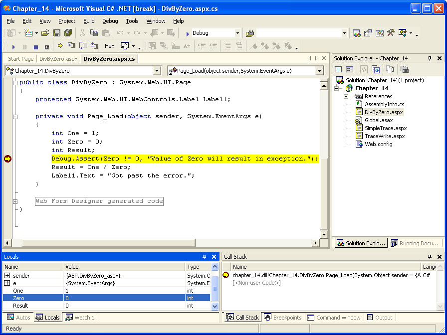 While it’s obvious what the problem is in this example, suppose you needed to determine exactly why the divide by zero exception was happening. One way to find out is to step through the code and check the values of your variables as each line executes. Start by scrolling down to the Page_Load event handler. Along the left side of the code window is a gray bar. Click on the gray bar to the left of the line with the Debug.Assert. A red dot indicating a breakpoint will appear on the gray bar, and the line will be highlighted. The following illustration shows the breakpoint set in Visual Studio .NET.