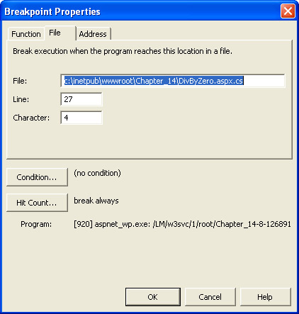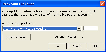 Click the Hit Count button. Change the value of the drop-down list labeled When the breakpoint is hit to break when the hit count is equal to. A text box should appear. Leave it set to 1. When the dialog box is set as shown in the illustration on the following page, click OK. Click OK again to close the Breakpoint Properties dialog box.