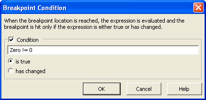 Change the properties of the breakpoint as shown earlier, setting the condition to Zero = 0. Run the application. This time, the breakpoint will be reached with a condition that is true, and you will be brought to the debugger. Use F10 to single-step through the code, and you will see exactly how the exception is thrown. Seeing how the code runs by single-stepping through it can often be a huge help.