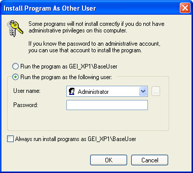 If you see this dialog box, you can either log out and log back in using an administrator account, or you can specify the user name and password of an administrative account from which to run the installation program.