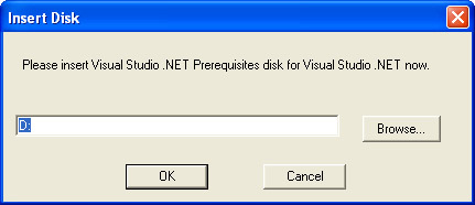 Insert disk 1 of Visual Studio .NET into your CD-ROM drive. (Change the drive letter displayed in the dialog box to the letter of your CD-ROM drive if necessary.) Click OK.